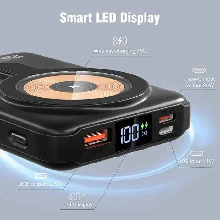 تصور کنید شما یک گوشی اندرویدی با پورت USB-C دارید، دوستتان آیفون با پورت لایتنینگ و هدفون بیسیمتان با USB-A شارژ میشود. با این پاوربانک، همه میتوانند همزمان و بدون نیاز به حمل چندین شارژر مجزا، دستگاههای خود را شارژ کنند. قابلیت شارژ وایرلس نیز یک مزیت فوقالعاده است؛ کافی است گوشی خود را (در صورت پشتیبانی از شارژ بیسیم) روی پاوربانک قرار دهید تا بدون نیاز به هیچ کابلی، شارژ شود. این ویژگی به خصوص در مواقعی که کابلهایتان را فراموش کردهاید یا نمیخواهید با شلوغی کابلها سروکار داشته باشید، بسیار کارآمد است.